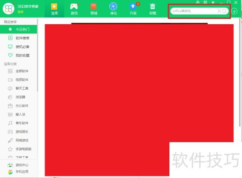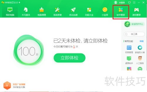 1、 首先打开电脑上的安全卫士,进入首页后,在顶部菜单栏中找到软件管家选项。