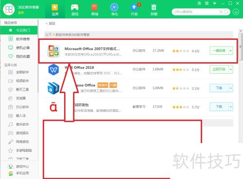 2、 在搜索框输入Office兼容包,查找并定位到Office 2007文件兼容包的搜索结果。