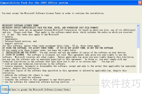 7、 兼容包的安装文件名为FileFormatConverters.exe,体积约37兆。下载完毕后,运行安装程序,勾选同意软件许可条款,然后点击Continue按钮,操作步骤所示。
