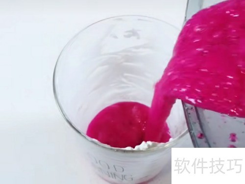 5、 把炸好的火龙果汁倒入杯中,杯口挤上一圈奶油,注意使用合适的裱花嘴,最后点缀些许火龙果丁即可。