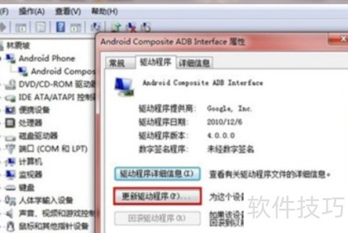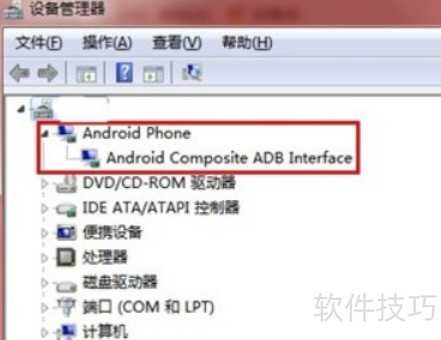 4、 打开设备管理器后,在列表中找到Android Phone即可查看手机当前状态。若图标显示正常,说明设备运行良好;若出现黄色感叹号或问号,则表示驱动异常,需重新安装对应驱动程序以恢复正常使用。