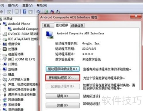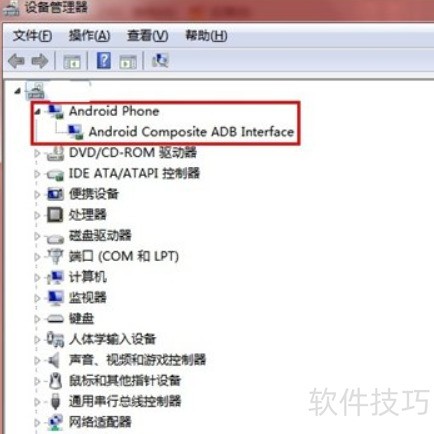 4、 打开设备管理器后,在列表中找到Android Phone即可查看手机当前状态。若图标显示正常,说明设备工作良好;若出现黄色感叹号或问号,则表示驱动异常,需重新安装对应驱动程序以恢复正常使用。