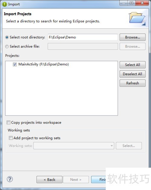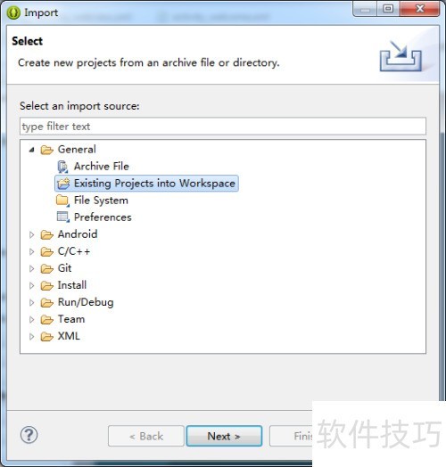 6、 打开Eclipse文件夹,运行其中的eclipse.exe程序启动开发工具。首次启动时,系统会提示设置工作空间路径,按要求指定目录后即可进入主界面。为演示导入过程,假设已有一个名为Demo的Android项目。在Eclipse中,点击菜单栏的File,选择Import,随后在弹出窗口中展开General项,双击Existing Projects into Workspace。点击Next按钮,在新界面中浏览并选中包含Demo工程的文件夹路径,最后点击Finish完成导入操作,项目将成功加载至当前工作区中,准备进行后续开发与调试。