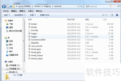 2、 在内核源码的Drivers/staging目录中创建一个名为android的文件夹,并将驱动程序文件复制到该目录下。