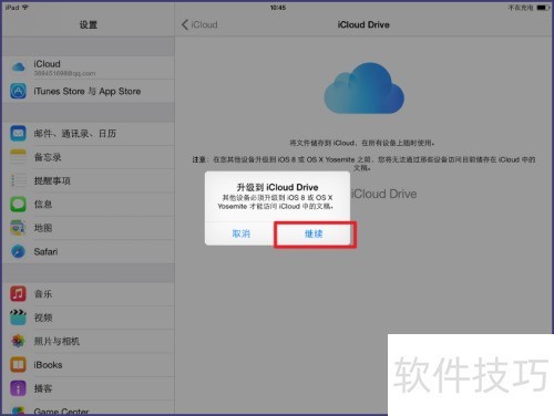 4、 点击升级到iCloud Drive后,请留意:若其他设备也登录了同一iCloud账号,这些设备必须升级至iOS 8,否则将无法访问存储在iCloud中的数据。对于无法升级至iOS 8的设备,建议谨慎操作,避免数据丢失。可考虑使用其他Apple ID进行升级,以确保旧设备正常使用原有iCloud内容。