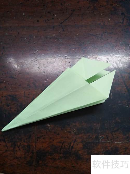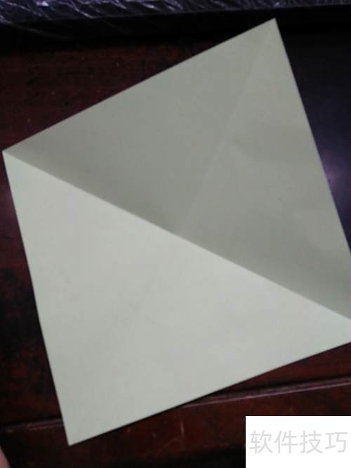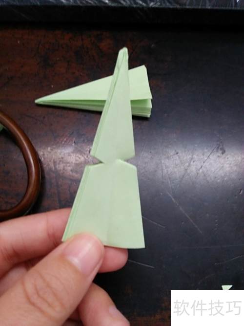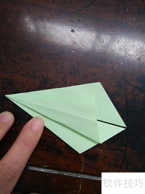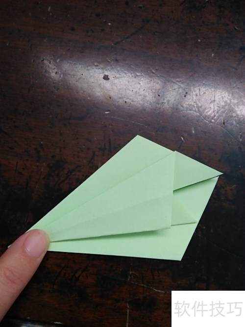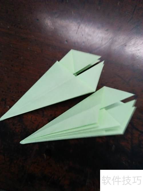 7、 将中间尖角向下压折,依次捏实所有折痕,再按图示展开另一张折纸。