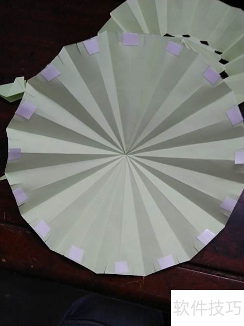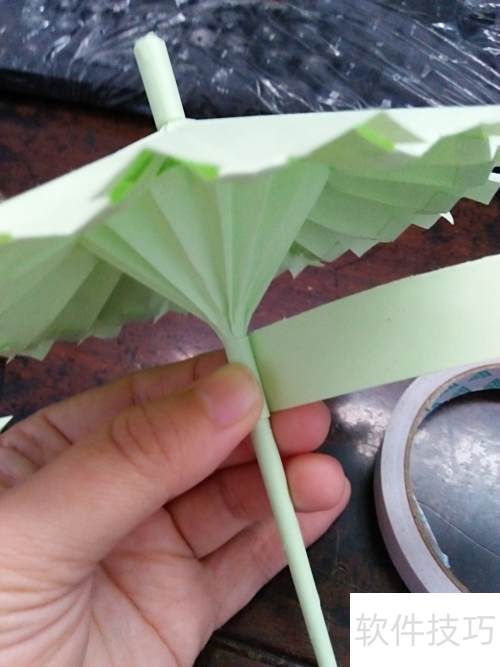9、 粘贴完毕后,取长方形纸卷成条状,用双面胶固定外缘,制成伞把。