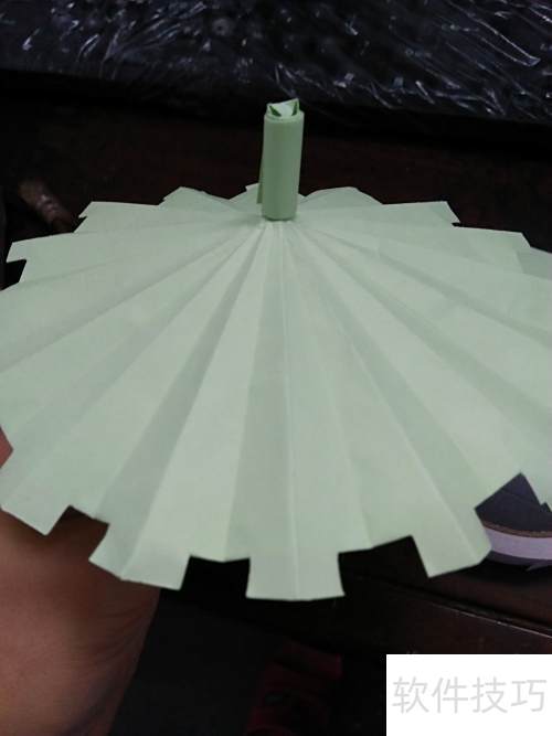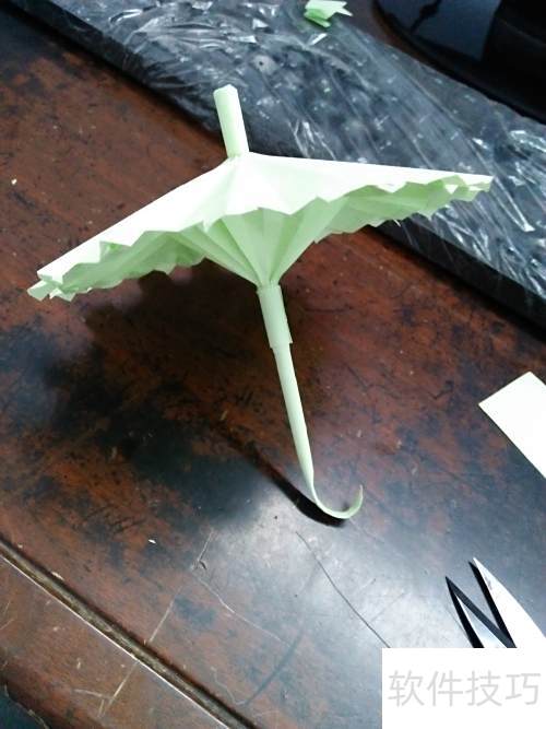 11、 在伞顶剪个小口,将纸棍插入伞中,具体所示。