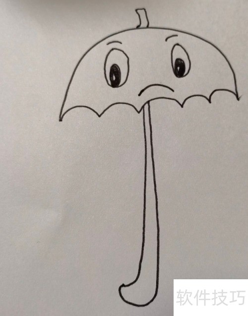 3、 在伞面画上弯弯的眉毛、大眼睛和向下的嘴形。