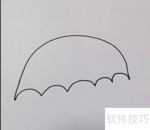 1、 用描线笔从左至右画一个向下的半圆弧,构成雨伞的顶部轮廓。