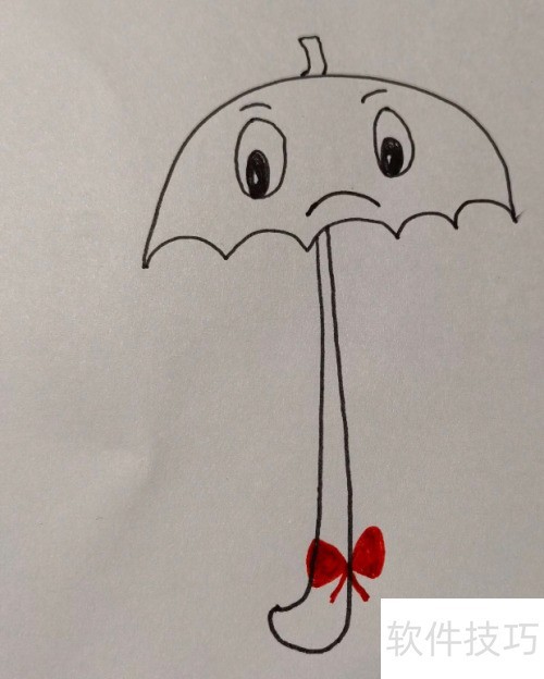 4、 在伞底添个红色小蝴蝶结,简单几笔,一幅可爱的简笔画就完成了。