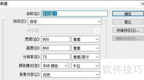 2、 新建一个800像素宽高的画布,点击确定即可。