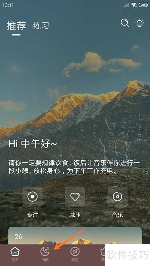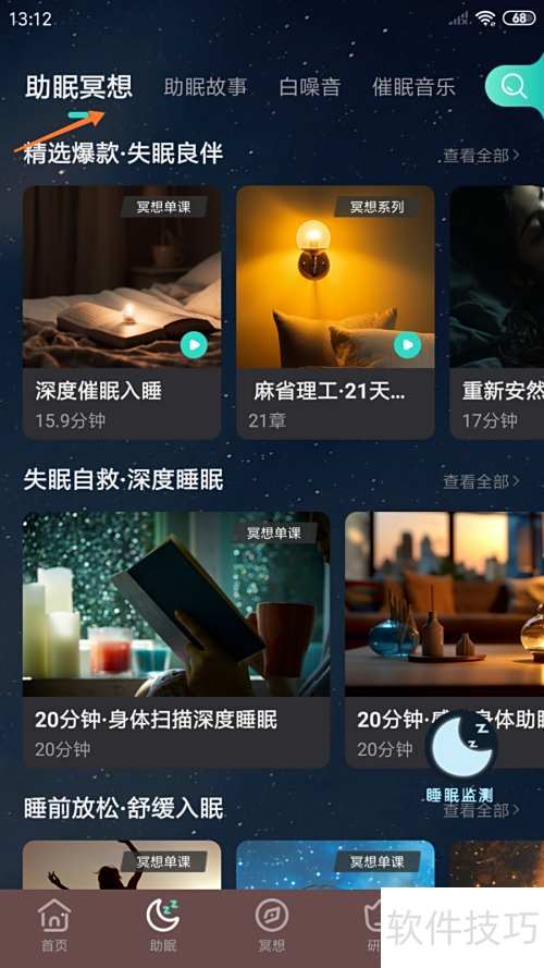 2、 进入助眠页面后,点击顶部的助眠冥想选项。
