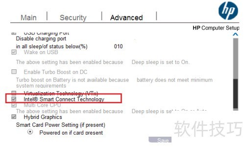 5、 所示,为惠普商用笔记本的BIOS界面。开机时按下F10键可进入BIOS设置,随后依次选择Advanced(高级)→Device Configuration(设备配置),找到Intel Smart Connect Technology选项,并勾选前方的复选框以启用该功能。完成后保存设置并退出即可。