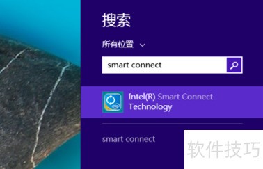 9、 在 Windows 8 系统中,将鼠标移至屏幕右上角,调出超级按钮后点击搜索,在搜索框中输入smart connect,随后从结果中选择Intel Smart Connect Technology即可打开相关设置界面,操作简单直观,方便用户快速访问该功能。