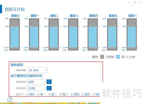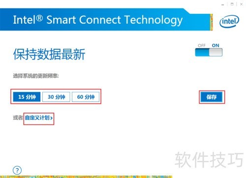 11、 开启后,可选15分钟、30分钟或60分钟更新频率,点击保存即可。还可通过自定义计划设置更具体的更新时间和频率。