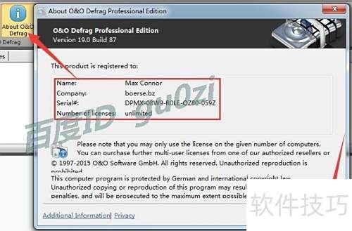 12、 此时返回O&O Defrag 19专业版主界面,点击关于O&O Defrag选项,即可查看到已注册的相关信息,表明软件已成功激活并完成注册。操作简单,结果明确,无需额外步骤即可确认注册状态。
