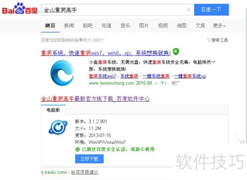 2、 推荐使用金山重装高手,或其他类似工具,点击即可下载安装。