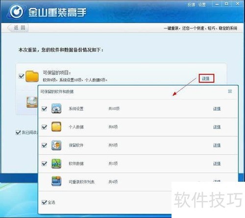 11、 重装系统后,部分软件需重新安装,高手会记录原系统未装软件,您只需勾选所需即可完成安装。
