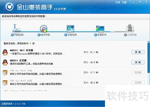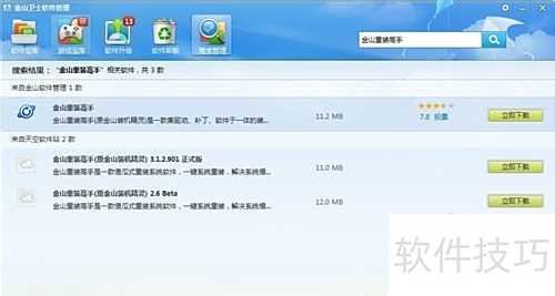 2、 建议通过金山安全卫士的软件管理功能搜索并下载金山重装高手,确保从官方应用商城获取。这样可避免第三方网站修改软件,防止植入对系统有害的内容,保障电脑安全稳定运行。