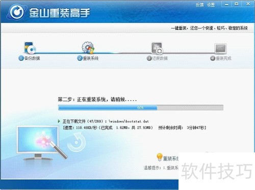 重装系统通常需要准备光盘或下载数百兆的镜像文件,过程繁琐,不仅要提前备份重要数据,还要重新安装驱动程序,对多数用户来说十分复杂。金山重装高手则简化了这一流程,无需光驱、U盘或系统盘,也无需手动寻找Windows 7或XP等系统下载资源,用户只需几步操作即可完成系统重装,大幅提升效率,真正实现一键还原与安装,让电脑维护变得轻松便捷,特别适合不熟悉技术操作的普通网民使用。