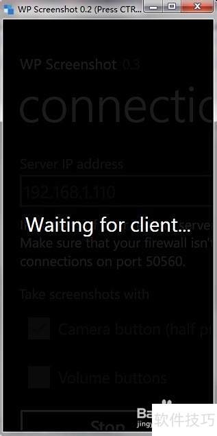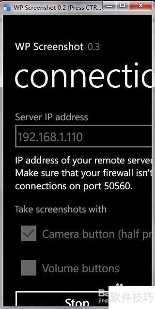 7、 在手机上打开WP Screenshot,将之前查到的IP地址填入地址栏,截屏方式可选半按相机键或音量键,设置完成后点击连接并开始即可。