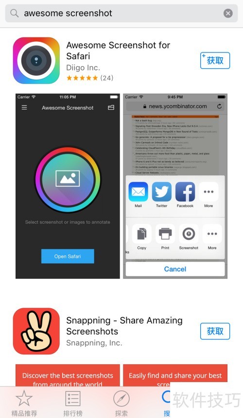 1、 打开App Store,搜索awesome Screenshot,下载并安装到iPhone即可。
