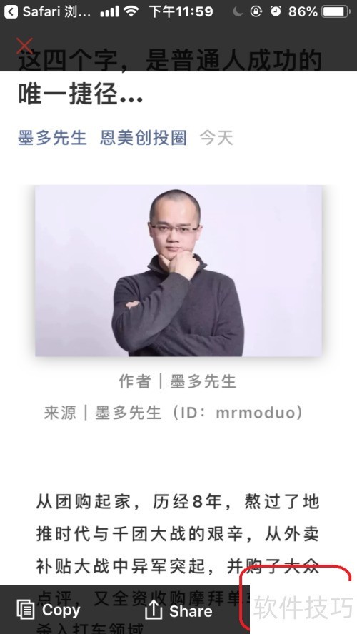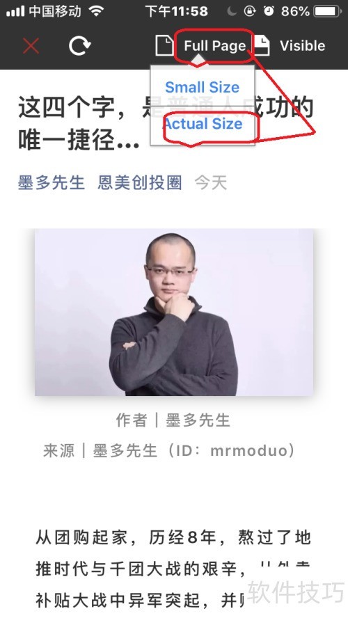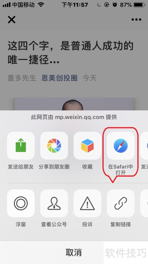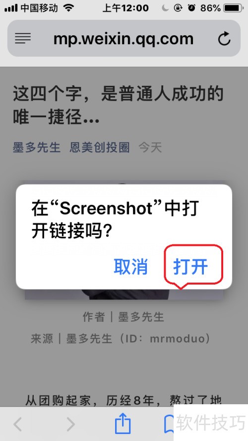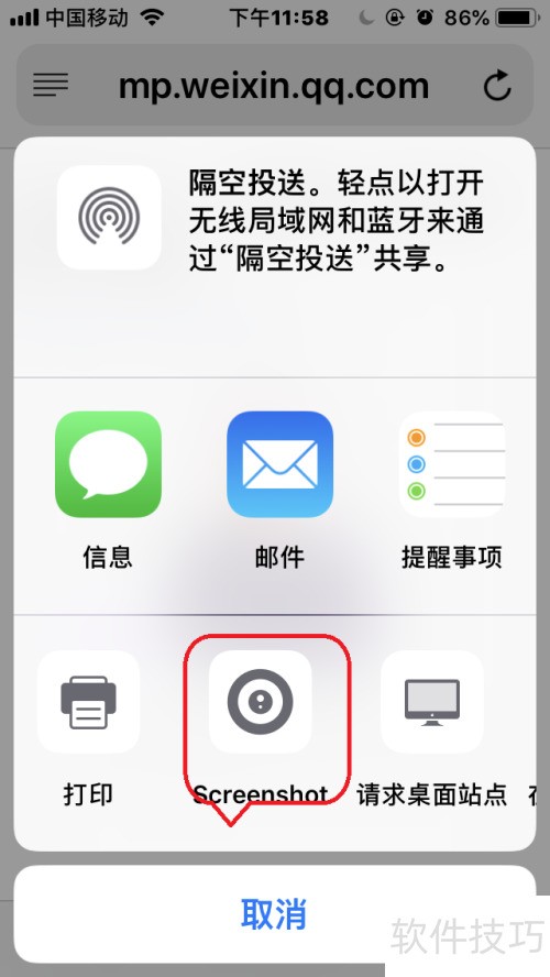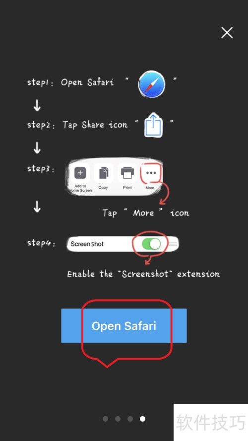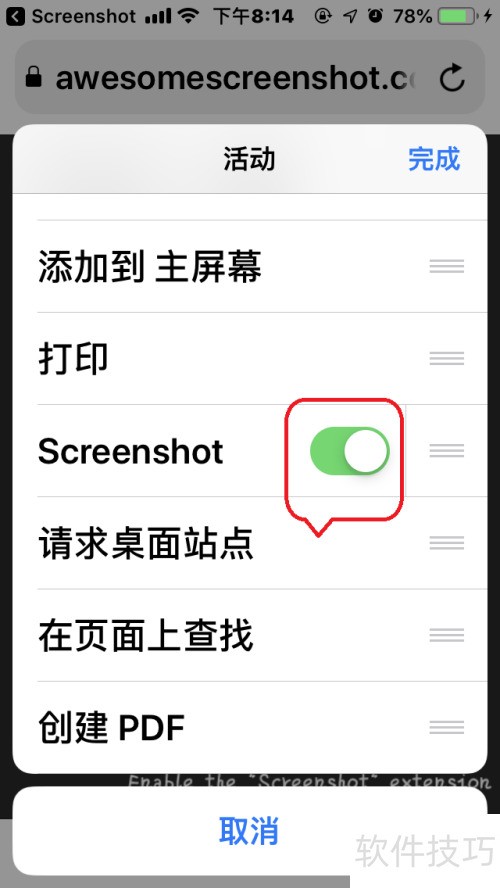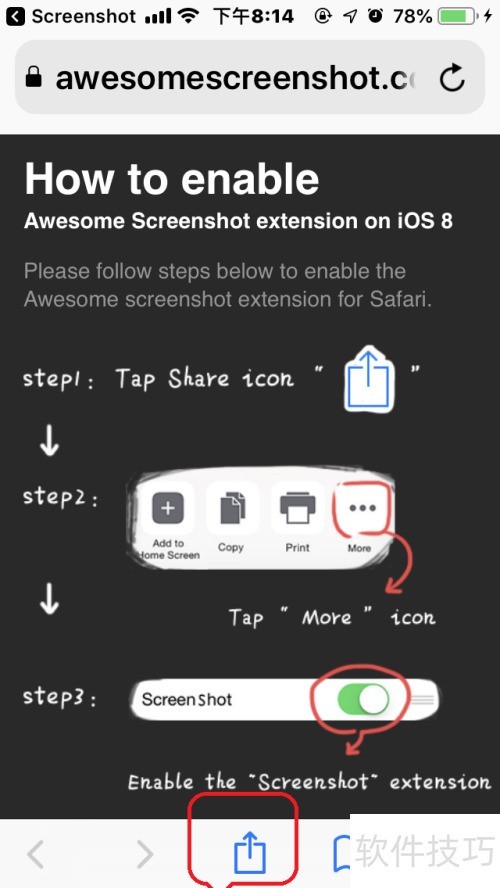 3、 打开Safari后,点击分享按钮,选择更多,找到screenshot并开启开关即可启用该功能。