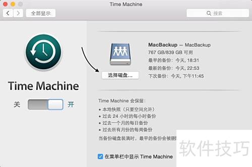 3、 请先确认 Time Machine 开关已开启,具体位置所示。