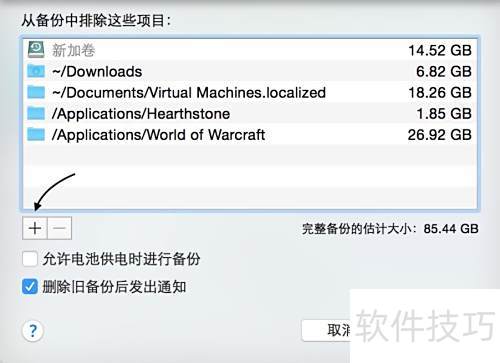 14、 点击窗口中的+按钮,可添加无需备份的目录。例如将下载文件夹和游戏文件夹排除在外,能显著减少备份数据量,提升效率。
