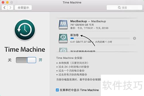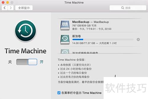 10、 在 Time Machine 设置界面中,勾选在菜单栏显示 Time Machine选项即可,效果所示。