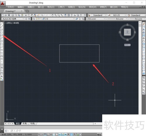 3、 用鼠标左键先点选矩形工具,再绘制一个矩形,完成后按Esc键退出。