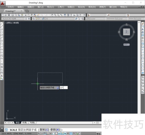 7、 向下拖动鼠标至任意位置,单击左键或输入2/1数值后按回车键,即可完成矩形放大操作。