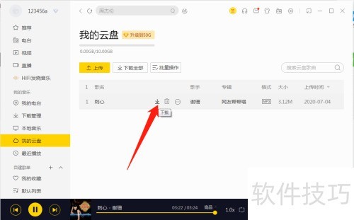 13、 登录同一账号后,可在我的云盘中将音乐文件下载到本地设备保存。