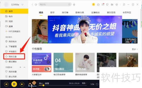 2、 打开酷我音乐首页,点击左侧菜单栏的我的云盘即可。