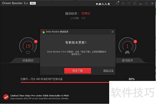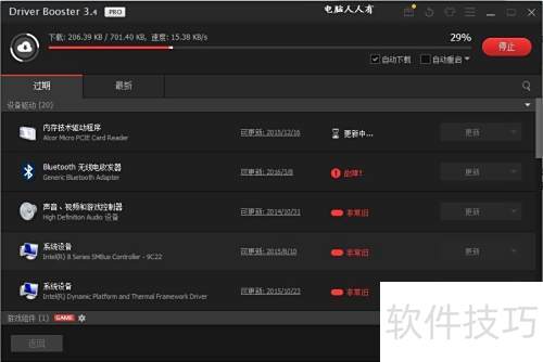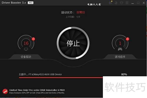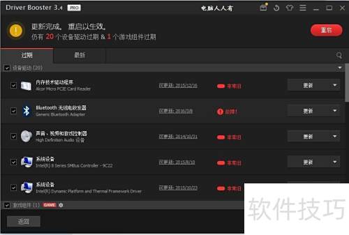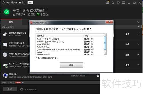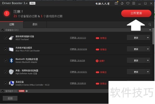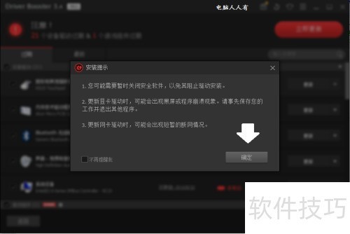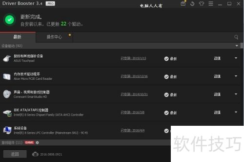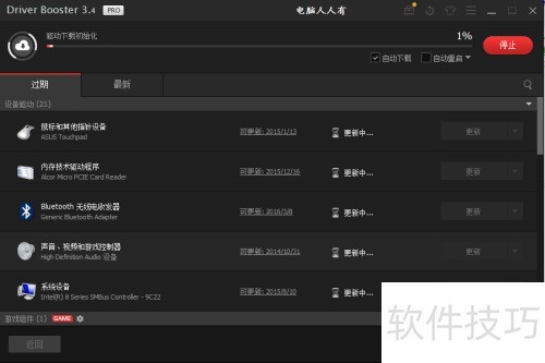 3、 安装Advanced SystemCare后,Driver Booster会自动在任务栏通知区域运行,扫描系统并识别需要更新驱动的设备,随后提示一键更新所有驱动程序。