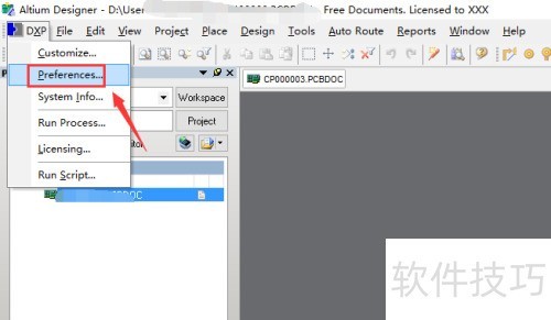 3、 在dxp菜单中点击优先设定,操作所示。