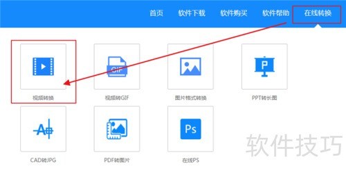 2、 进入网站后,将鼠标移至顶部右侧在线转换栏目,从下拉菜单中选择视频转换,即可进入视频格式转换页面。
