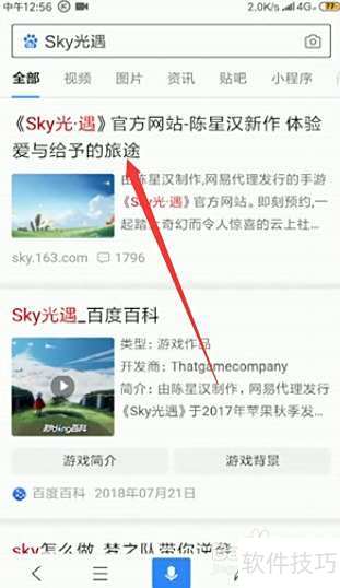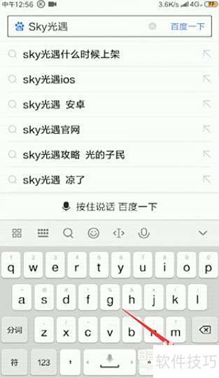 1、 打开手机百度应用,进入顶部搜索框,输入Sky光遇后点击搜索按钮。