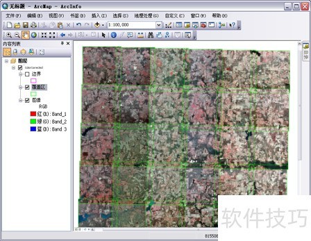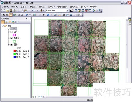 37、 在标准工具栏的比例框中输入150000后按回车。此时应能看见镶嵌数据集中的影像,但并非所有影像都会显示,因默认最多仅绘制20个栅格。