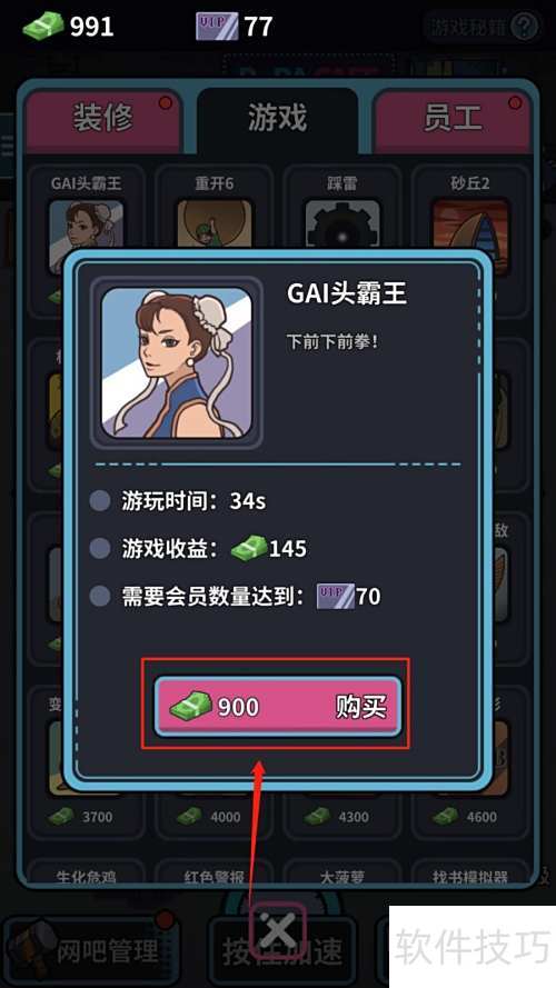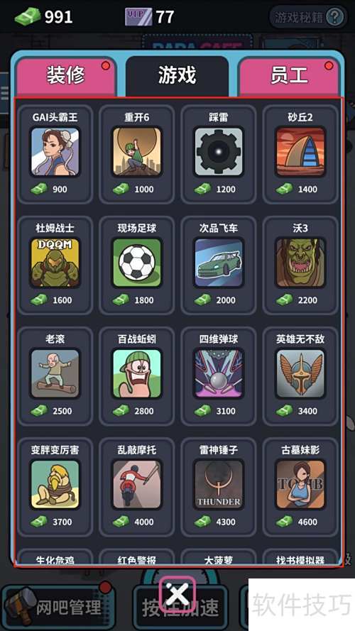 网吧模拟器中购游戏教程:进入商店,选游戏,确认支付即可完成购买。