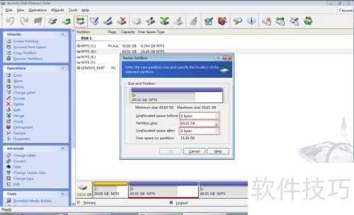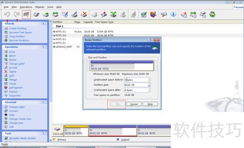 4、 首先点击调整大小功能,弹出设置窗口。若需将60GB的D盘缩小至40GB,系统提供三种调整方式供选择,按需求操作即可完成分区容量变更。