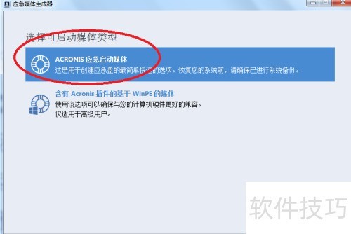 3、 点击应急媒体生成器后,进入新界面,选择ACRONIS应急启动媒体,这是创建应急盘最简便快捷的方式,适用于系统故障时的紧急恢复操作。