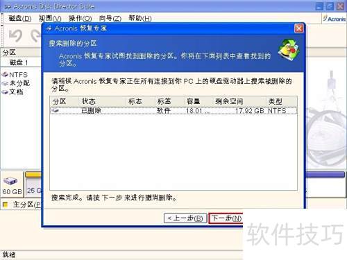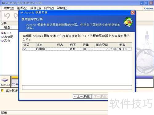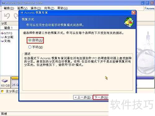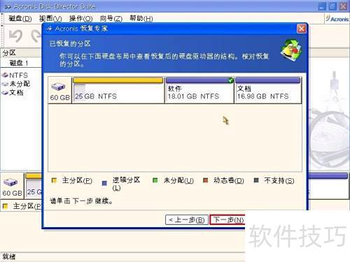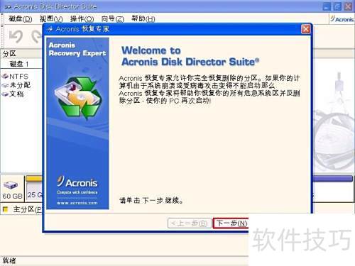 4、 单击工具栏向导—恢复分区,启动Acronis恢复专家窗口,随后点击下一步按钮,操作界面所示。