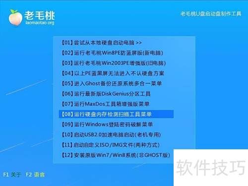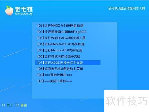 1、 将老毛桃U盘插入电脑USB接口,按下电源键开机,出现品牌Logo时立即点击快捷键进入主菜单,选择运行硬盘内存检测扫描工具菜单,按回车执行,具体操作所示。