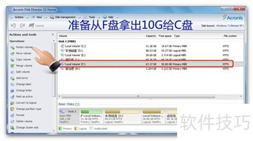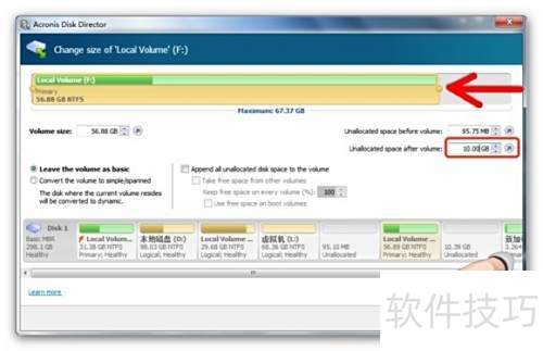 9、 通过调整红色箭头或帽销框,将F盘容量减少10G。