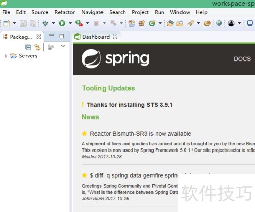 3、 启动STS后,界面与Eclipse极为相似,仅在功能上新增了大量Spring相关的应用模块,整体布局保持一致。