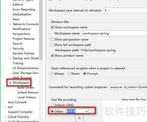 4、 接下来对STS进行优化配置,大部分设置可参照Eclipse的相关调整。首先修改STS的默认编码为UTF-8,操作步骤如下:在菜单栏中依次选择Windows→Preferences→General→Workspace,在Text file encoding区域选择Other,随后从下拉列表中选定UTF-8编码格式。此设置有助于避免中文字符出现乱码问题,提升开发过程中的文件兼容性与稳定性,确保项目在不同环境中正常运行。其他优化建议也可参考Eclipse的配置方案。
