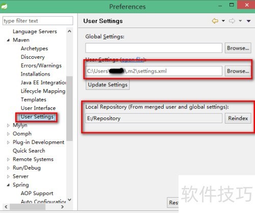 6、 接下来需配置Maven的settings.xml文件及本地仓库路径。进入Windows菜单,选择Preferences,然后找到Maven下的User Settings选项,在右侧指定本机Maven安装目录中settings.xml的位置,并设置Repository的存储路径,确保开发环境正确识别Maven配置。