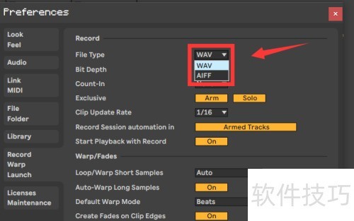 5、 在录音设置界面中,找到File Type选项,这里可选择音频格式,推荐选用Wav或Aiff格式,选定后即完成设置。